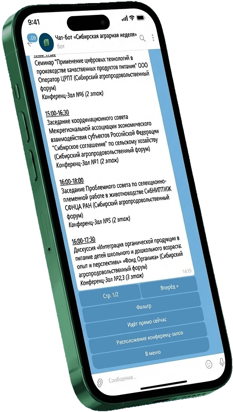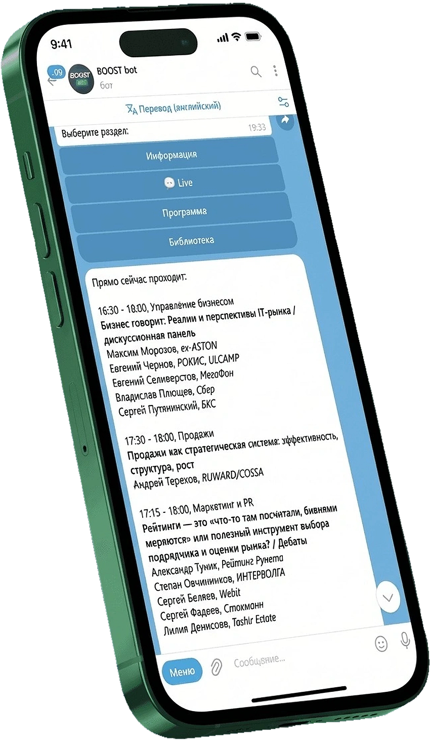 Бот-помощник знает всё: покажет программу, найдет лекцию по ключевому слову, подскажет, где перекусить, откроет доступ к библиотеке записей прошлых лет